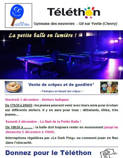 – La « Nuit de la Petite Balle » avec un créneau de « Dark Ping » ou comment jouer au ping en fluo du samedi 8 à19h30 au dimanche 9 à 13h00.